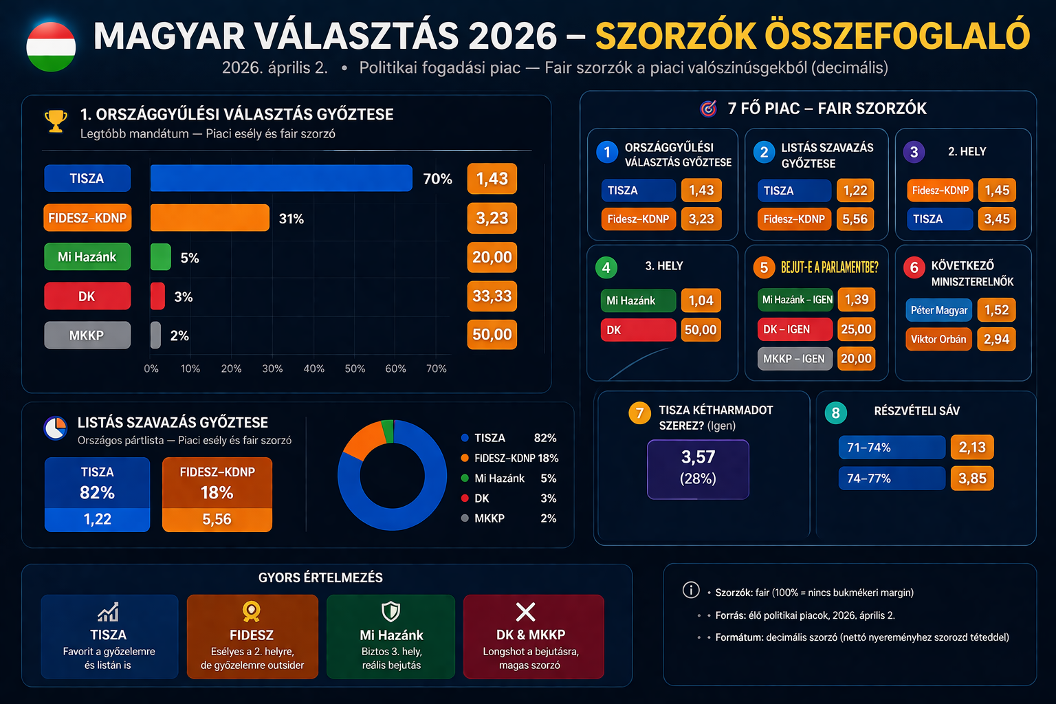 Sportfogadási szemmel nézve a jelenlegi magyar választási piacot három részre lehet bontani. Az első a fő irány, ahol a TISZA-favorit narratíva dominál. A második a helyezési piacok, ahol a Fidesz második helye és a Mi Hazánk harmadik helye tűnik a legstabilabb szerkezetnek. A harmadik a küszöbpiac, ahol a Mi Hazánk bejutása tűnik reálisnak, míg a DK és az MKKP inkább longshot kategória. Aki tehát nem csak egyetlen nagy győztesfogadásban gondolkodik, annak ez a választás inkább több külön piac kombinációjáról szól, mintsem egyetlen "ki nyer?" típusú tippről.