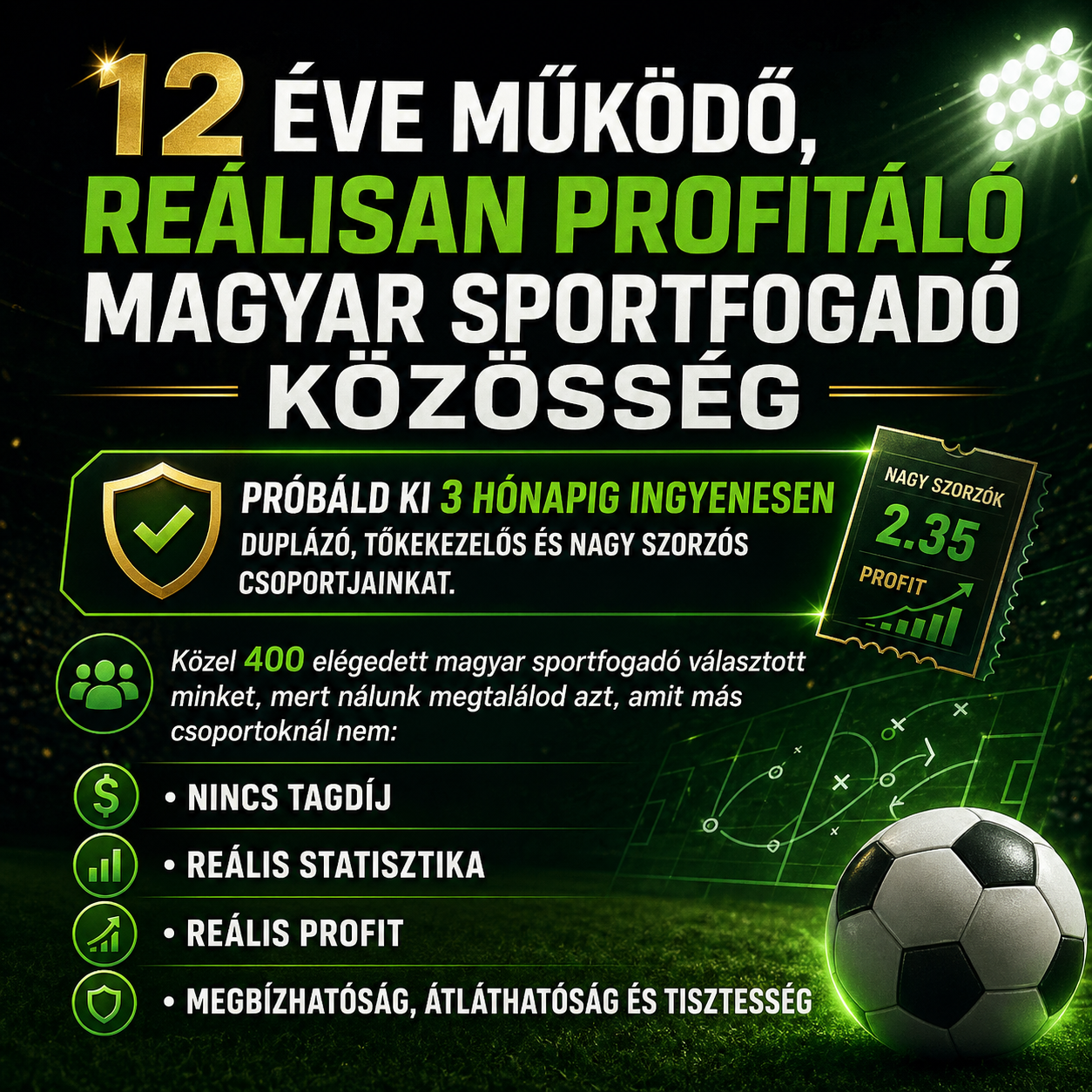 Reális profitra törekvő, átlátható és könnyen követhető Tippmix-tippeket kapsz, kezdőknek és tapasztalt sportfogadóknak egyaránt.